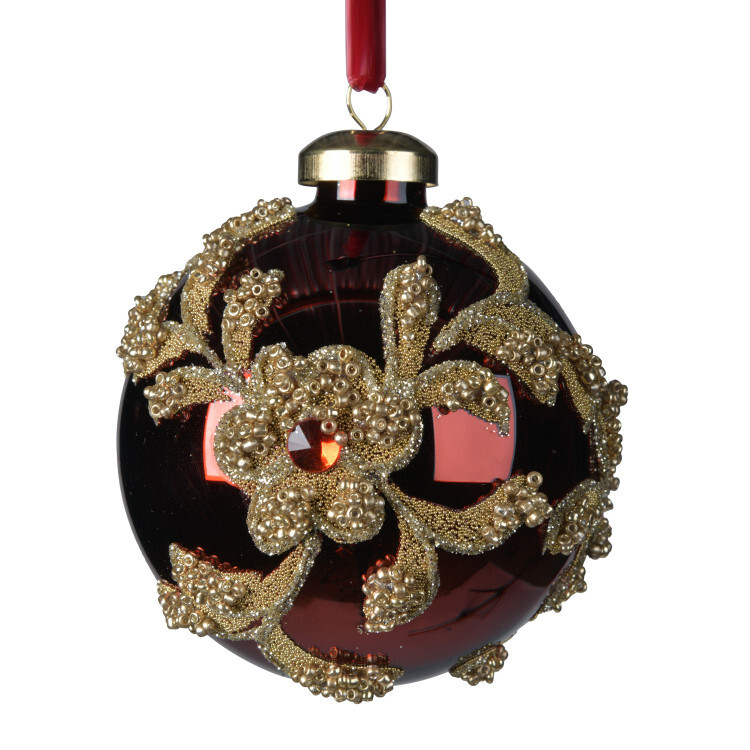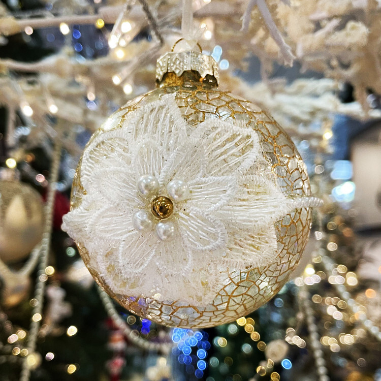 19) Шар стекло золотой с кружевным цветком d8см 3шт/уп (артикул: KA060558);