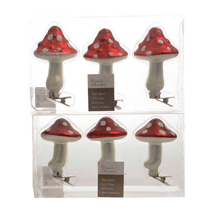10) Декор Мухомор стекло красно-белый на клипсе 6,5x9см 3шт/уп (Артикул: KA129241);
