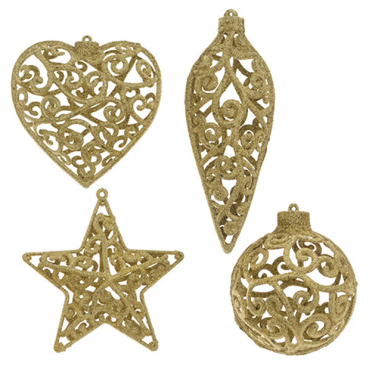 5) Декор Звезда/Сердце/Сосулька/Шар золотые ажурные 4 в ассорт (артикул: KA515195);