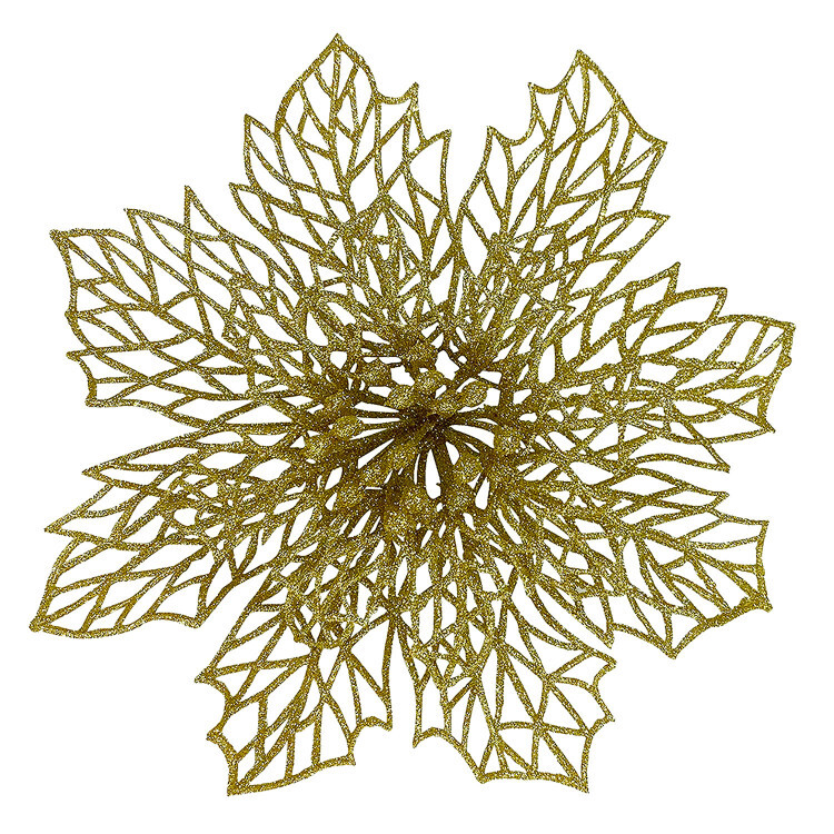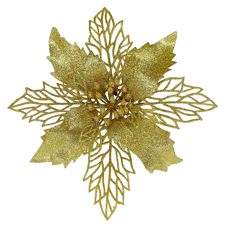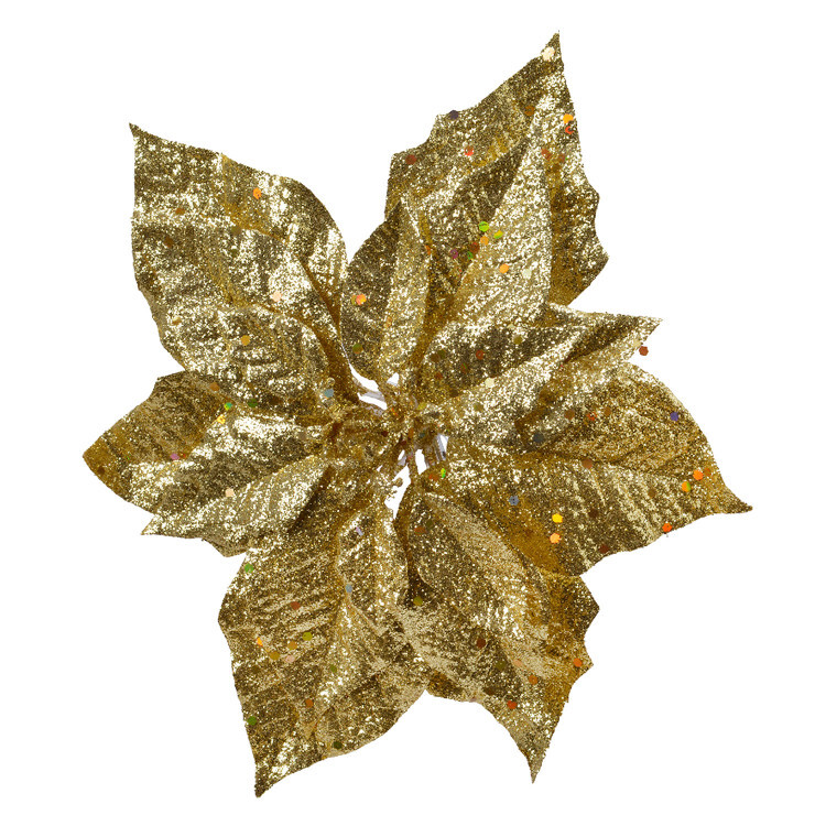 6) Декор Пуансеттия золотистая с блеском на клипсе 23см (артикул: KA629441);