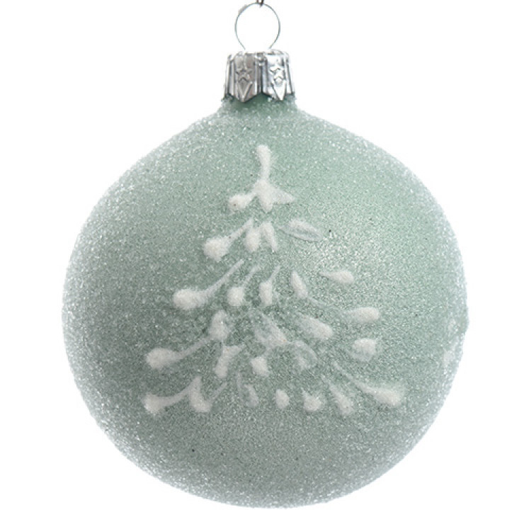 16) Шар стекло эвкалиптовый с елочкой и изморозью d8см (артикул: KA086356).