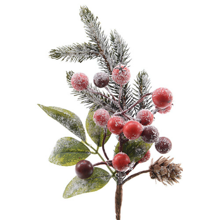 15) Веточка еловая 20см заснеженная с красными ягодами и шишками (артикул: KA685154);