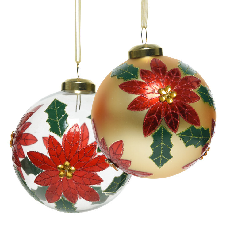 5) Шар стекло прозрачный/золотой с пуансеттией d8см 3шт/уп (артикул: KA060445);